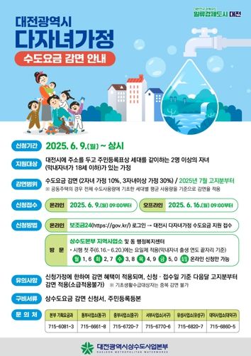 대전시 상수도사업본부는 오는 7월 고지분부터 다자녀가정을 대상으로 수도요금 감면 제도를 시행한다. 이번 감면 정책은 인구 감소에 대응하고 다자녀가정의 경제적 부담을 줄이기 위한 취지로 마련됐다.