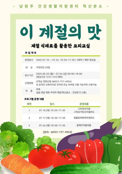도민방송 정연호기자 | 남원주건강생활지원센터 혁신분소는 오는 30일부터 ‘이 계절의 맛’ 건강 요리 교실 프로그램 참여자를 모집한다.