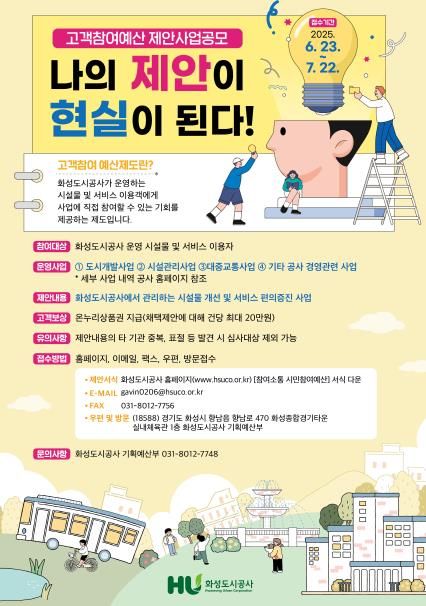도민방송 정연호기자 | 화성도시공사는 시민의 의견을 수렴해 예산에 반영하는 ‘고객참여예산 제안사업’ 공모를 오는 6월 23일부터 7월 22일까지 한 달간 실시한다고 밝혔다.