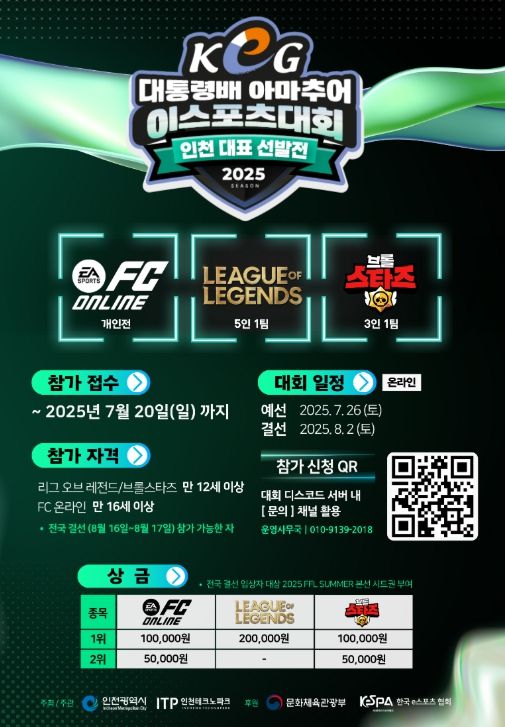 올해 전국 결선은 오는 8월 16~17일 양일간 충북 제천에서 열릴 예정으로, 인천TP와 인천시는 인천 대표를 뽑기 위해 ▲FC온라인(개인전) ▲리그오브레전드(5인 1팀) ▲브롤스타즈(3인 1팀) 등 3개 종목의 선발전을 개최한다.