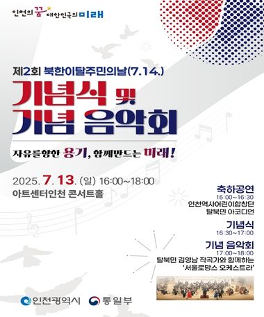 도민방송 문성호기자 | 인천광역시는 ‘북한이탈주민의 날’을 맞아 오는 7월 13일 아트센터인천 콘서트홀에서 ‘제2회 북한이탈주민의 날 기념행사’를 개최한다고 밝혔다.