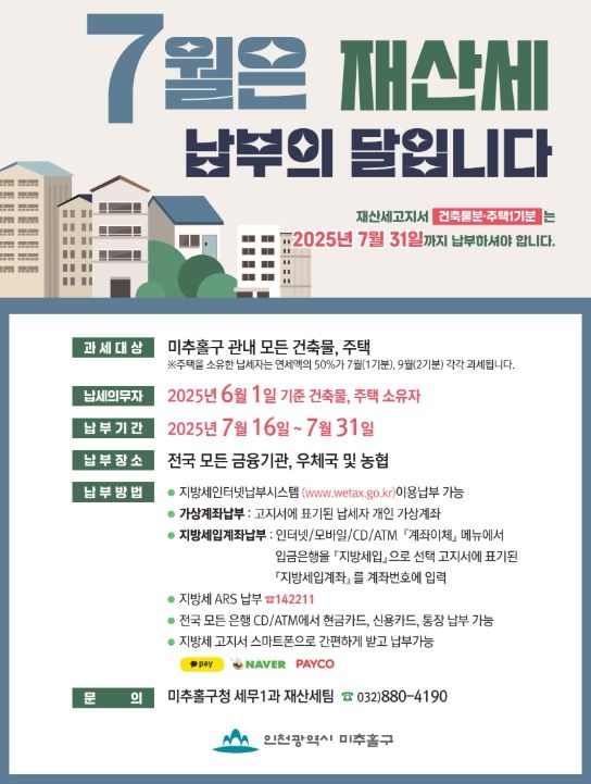 도민방송 문성호기자 | 인천 미추홀구는 7월 정기분 재산세 363억 원(지역자원시설세, 지방교육세 포함)을 부과했다고 10일 밝혔다.