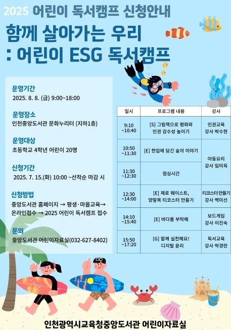 도민방송 문성호기자 | 인천광역시교육청중앙도서관은 8월 8일, 남동구 관내 초등학교 4학년 및 동 연령의 어린이를 대상으로 ‘어린이 ESG 독서캠프’를 개최한다.
