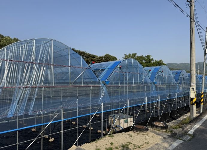 '포도 하우스형 비가림 시설 설치 시범사업'은 높이를 약 4~5m로 높여 기존 노지 비가림 시설보다 더욱 높게 설치하여 더운 공기가 머물지 않고 빠져나갈 수 있도록 개선했다.