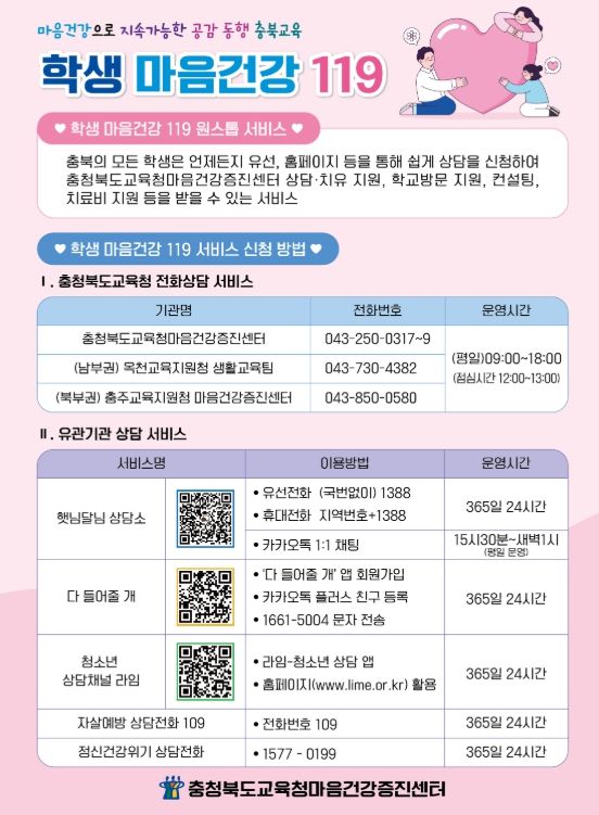 도민방송 문성호기자 | 충청북도교육청은 25일, 여름방학 기간 중 관계의 공백을 막기 위해 학생 마음건강 119 원스톱 서비스를 방학 중에도 지속‧강화 운영한다고 밝혔다.