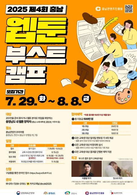 도민방송 문성호기자 | 충남콘텐츠진흥원은 충남지역 웹툰 창작자 역량 강화를 위한 『2025 제4회 충남 웹툰 부스트 캠프』 참가자를 오는 7월 29일부터 8월 8일까지 11일간 모집한다고 밝혔다.