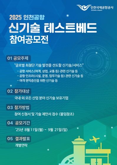 (도민방송=충남) 문성호기자 | 인천국제공항공사는 인천공항의 인프라를 국내․외 기업에 개방해 최첨단 기술의 실증을 지원하는 ‘2025 인천공항 신기술 테스트베드 공모전’을 시행한다고 18일 밝혔다.