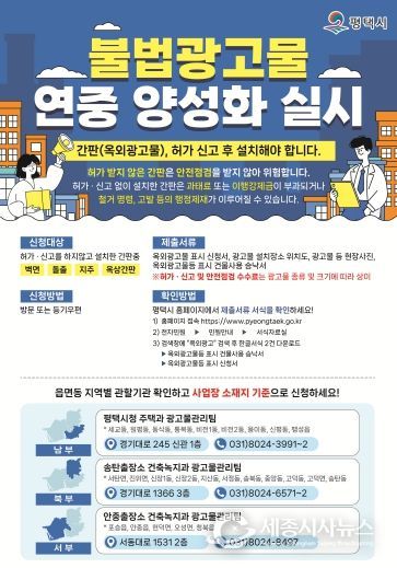 도민방송 정연호 기자 | 평택시는 시민의 안전과 도시 미관을 해치는 불법 광고물 문제를 해소하고, 옥외광고물의 체계적인 관리를 위해 ‘불법 광고물 연중 양성화’를 실시한다고 밝혔다.