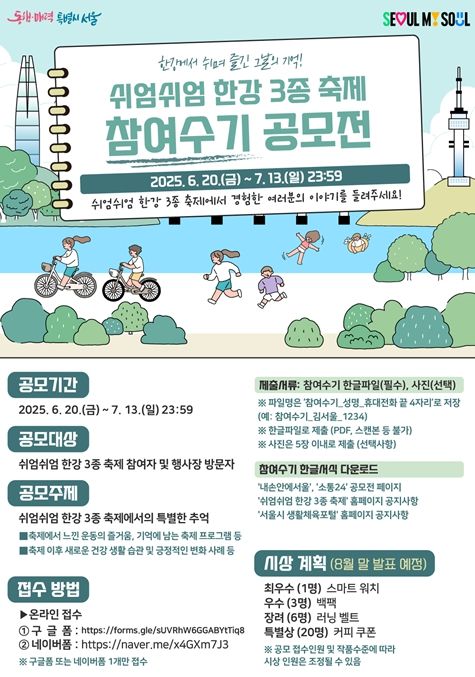 공모주제는 ‘쉬엄쉬엄 한강 3종 축제에서의 특별한 경험’이며 축제에서 느낀 운동의 즐거움, 기억에 남는 프로그램, 축제를 계기로 만든 새로운 건강생활습관, 축제로 인한 긍정적인 변화 사례 등 자신만의 경험담을 자유롭게 작성하면 된다.