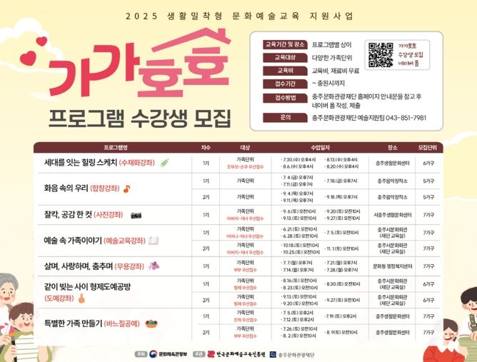 도민방송 문성호기자 | 충주문화관광재단이 2025년 생활밀착형 문화예술교육지원사업 ‘가가호호’ 수강생을 모집한다.