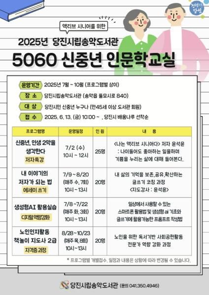 도민방송 문성호기자 | 당진시립도서관는 송악도서관에서 7월부터 10월까지 신중년을 위한‘5060 신중년 인문학교실’을 운영한다고 24일 밝혔다.