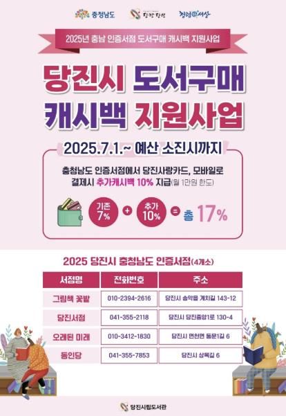 이 사업은 충청남도 인증을 받은 당진 지역 서점에서 지역화폐인 당진사랑상품권으로 도서를 구매할 경우, 결제 금액의 10%를 월 1만 원 한도 내에서 실시간으로 적립금 환급해 주는 제도다. 기존 당진사랑상품권의 7% 할인 혜택에 10%가 추가돼, 최대 17%의 실질적 구매 혜택이 제공되는 셈이다.