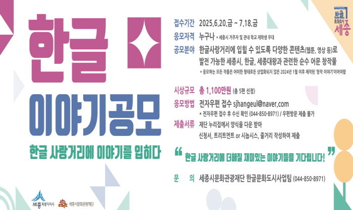 이번 공모는 세종시, 한글, 세종대왕을 주제로 한 창작 이야기를 발굴해, 거리 큐레이션과 프로그램 기획에 반영하기 위해 마련됐다. 선정된 이야기는 향후 영상·웹툰 등 다양한 콘텐츠로 확장될 수 있도록 고도화 컨설팅도 지원한다.