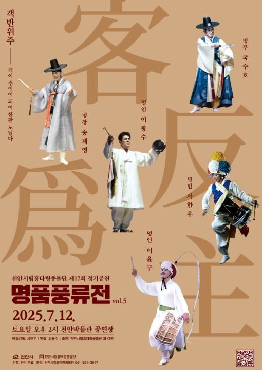 공연은 천안시립흥타령풍물단의 ‘농부가 설장고’를 비롯해 국수호 명인의 ‘장한가’, 사물놀이 창시자 이광수 명인의 ‘비나리’, 송재영 명인의 판소리 ‘춘향가’, 이윤구 명인의 ‘채상 북놀이’, 서한우 명인의 ‘설장고춤’으로 구성된다.