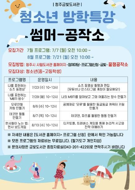 청주금빛도서관 관계자는 “이번 특강은 청소년들의 창의성과 자기표현력을 키우는 데 도움이 될 수 있도록 기획했다”며, “즐겁고 유익한 여름방학을 보낼 수 있도록 많은 참여를 바란다”고 전했다.