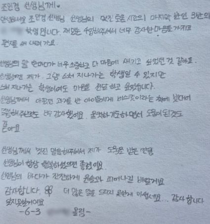북멘토로 참여한 조인경 선생님은 “짧은 만남이었지만, 책을 통해 마음이 연결되는 기적 같은 순간을 경험했다”며 “학생이 전해준 진심 어린 편지가 오히려 나에게 큰 응원이 됐다”고 소감을 전했다.