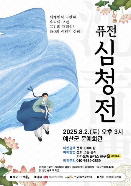 이번에 선정된 ‘예술지원 매칭펀드’ 사업은 홍익그룹(회장 김병준)의 민간 후원금 2000만원에 국비 1500만원이 매칭되는 방식으로 추진되며, 창작극 ‘퓨전 심청전’을 공연할 예정으로 해당 공연은 8월 2일 오후 3시 예산군문예회관에서 열린다.