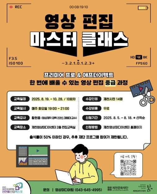 수강료는 무료이며, 기초적인 영상 편집 지식을 갖춘 제천시민 14명을 대상으로 선착순 모집한다. 신청은 제천영상미디어센터 홈페이지를 통해 가능하다.