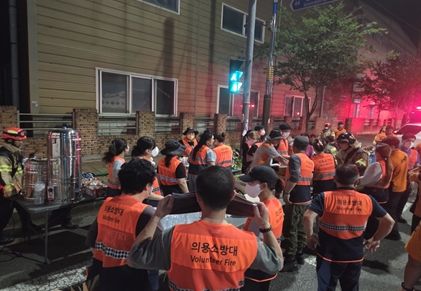 의용소방대원들은 화재 진압에 투입된 소방대원들을 위해 김밥과 라면 등 간식과 생수, 냉커피를 제공하며, 폭염 속에서 고된 임무를 이어가는 대원들에게 잠시나마 쉴 수 있는 휴식 공간도 마련했다.