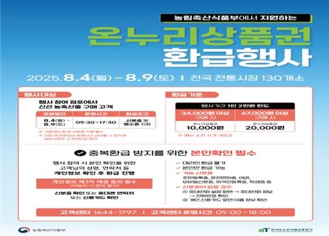 행사 기간 동안 국내산 신선 농축산물을 구매한 소비자에게 구매 금액에 따라 최대 30%까지 온누리상품권으로 환급해 준다.