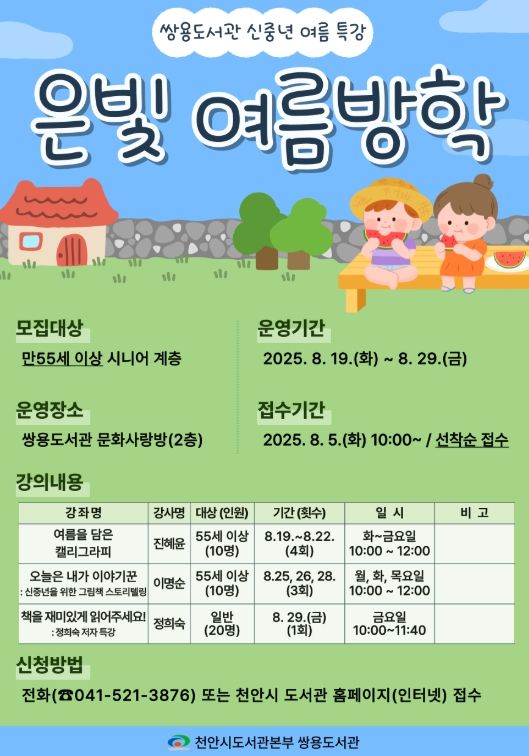 도민방송 문성호기자 | 천안시 쌍용도서관은 오는 8월부터 55세 이상 신중년 대상 ‘은빛 여름방학’ 프로그램을 운영한다고 31일 밝혔다.