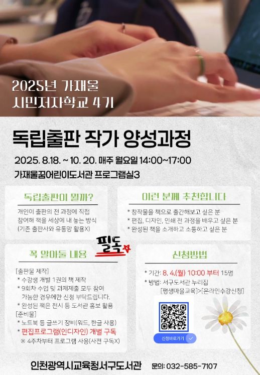 도민방송 문성호기자 | 인천광역시교육청서구도서관은 가재울 시민저자학교 4기 프로그램으로 ‘읽걷쓰 독립출판 작가 양성과정’을 운영한다.