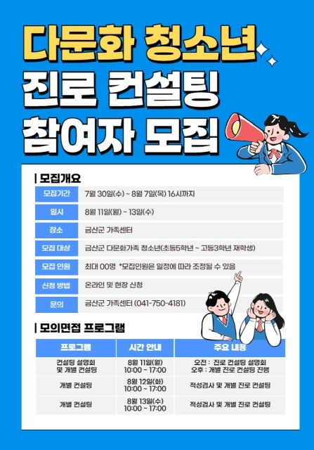 주요 프로그램으로는 △진로 컨설팅 설명회 △적성검사 △개별 진로 컨설팅 등이 있으며 8월 11일부터 13일까지 금산군가족센터에서 운영될 예정이다.