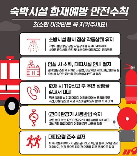김종욱 소방서장은 “숙박시설은 낯선 환경인 만큼, 화재 발생 시 혼란이 가중될 수 있다”며 “이용객 스스로가 안전수칙을 숙지하고 실천하는 것이 무엇보다 중요하다”고 강조했다.