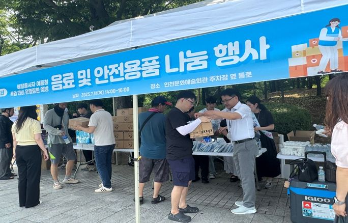 도민방송 문성호기자 | 인천광역시는 7월 31일 오후 2시부터 인천문화예술회관 주차장에서 쿠팡이츠 서비스와 협업해 인천 지역 배달업 종사자 200여 명을 대상으로 ‘생수, 음료 및 안전용품 나눔 행사’를 개최했다고 밝혔다.