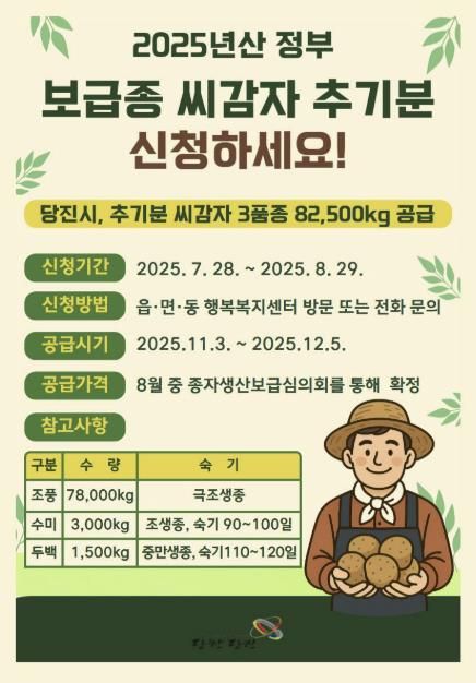 도민방송 문성호기자 | 당진시농업기술센터는 농민들의 소득 증가와 안정적인 감자 생산 기반 마련을 위해 8월 29일까지 2025년산 정부 보급종 씨감자 추기분 신청을 받는다고 1일 밝혔다.