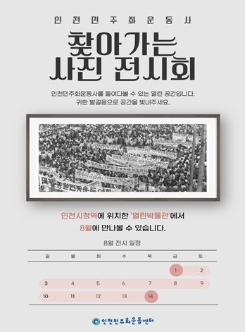 도민방송 문성호기자 | 인천광역시 시립박물관은 8월 1일부터 8월 14일까지 인천지하철 1호선 인천시청역 내 ‘열린박물관’에서 대관전시 ‘인천민주화운동사 찾아가는 사진 전시회’를 개최한다고 밝혔다.