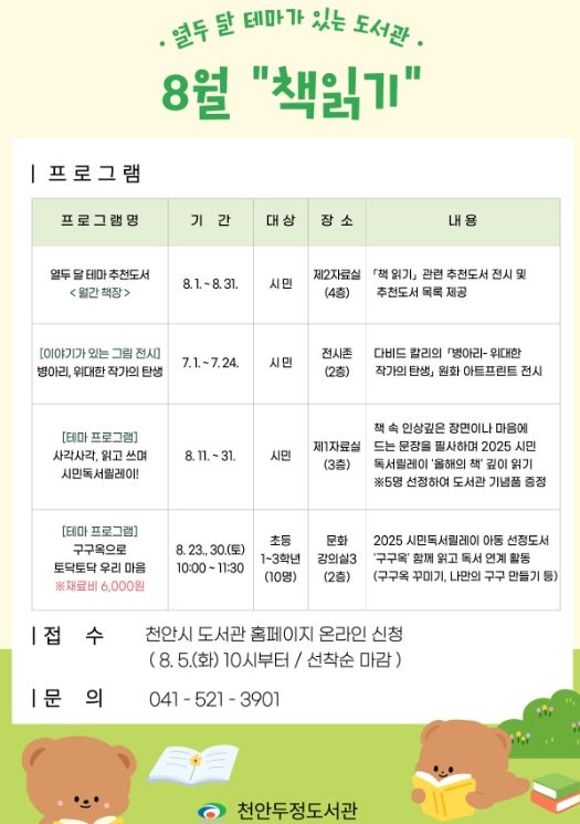 프로그램 접수는 오는 8월 5일부터 천안시도서관 누리집에서 가능하며, 문의 사항은 두정도서관으로 하면 된다.