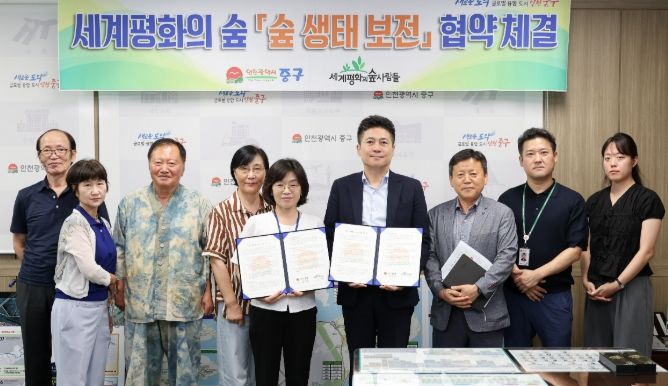 김정헌 인천 중구청장과 이기혜 세계평화의숲사람들 대표는 지난 31일 중구 제2청사에서 ‘세계평화의 숲 생태 보전 업무 협약’을 체결했다.