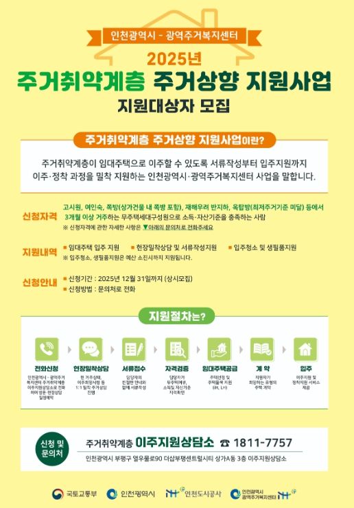 중구는 각 동 행정복지센터를 통해 수시로 대상자를 접수하고 있으며, 자격 요건 심사를 거쳐 적격 가구를 인천도시공사(iH), 한국토지주택공사(LH) 등에 추천해 공공임대주택 연계 지원을 추진할 계획이다.