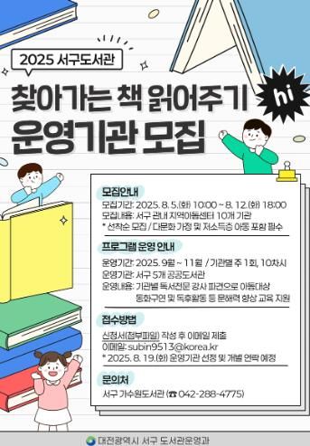 참여를 희망하는 지역아동센터는 8월 5일 오전 10시부터 12일 오후 6시까지 서구도서관 홈페이지에서 신청서를 내려받아 작성한 뒤, 담당자 이메일로 제출하면 된다.
