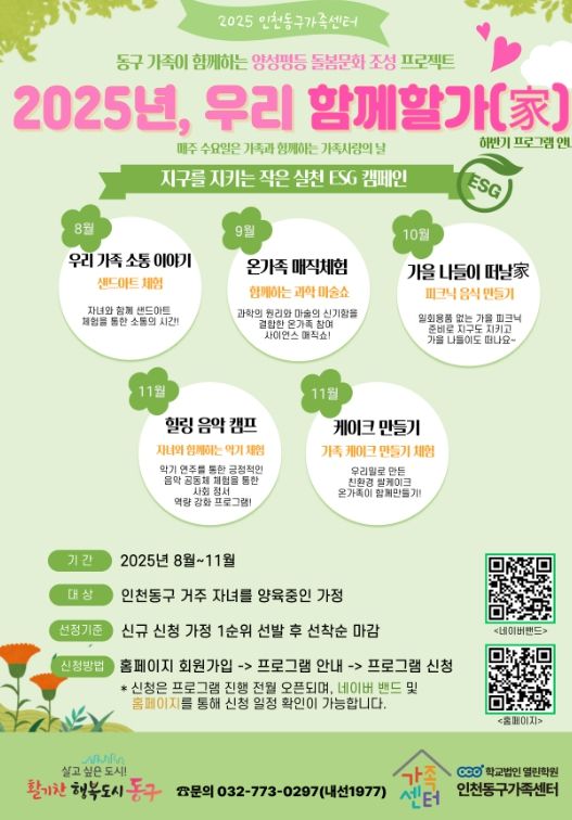 한편 인천동구가족센터는 지역사회와 동행하고 서로 돕는 가족 공동체를 형성하기 위해 다양한 사업을 진행하고 있으며, 홈페이지를 통해 다양한 소식을 접할 수 있다.