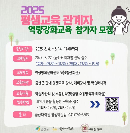 도민방송 문성호기자 | 금산다락원은 8월 4일부터 14일까지 2025년 평생교육 관계자(실무자, 강사, 매니저) 역량강화교육 참여자를 모집한다.
