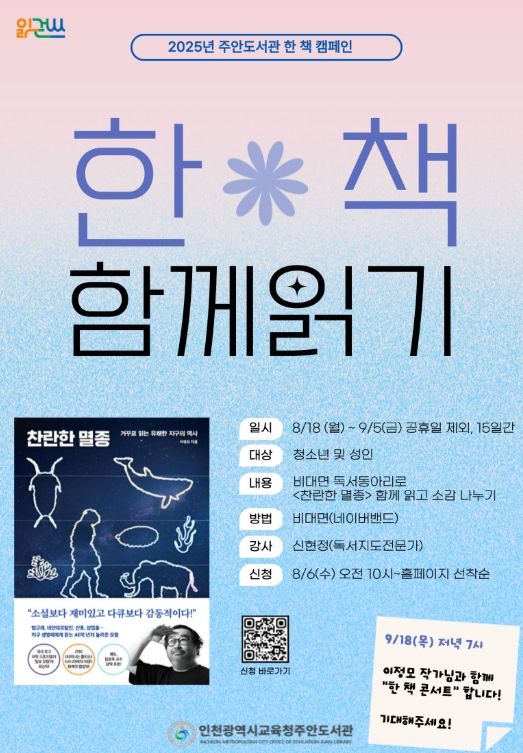 도민방송 문성호기자 | 인천광역시교육청주안도서관은 2025년 ‘한 도서관 한 책’ 캠페인의 일환으로 ‘SNS 한 책 함께 읽기’ 프로그램을 오는 8월 18일부터 9월 5일까지 운영한다고 밝혔다.