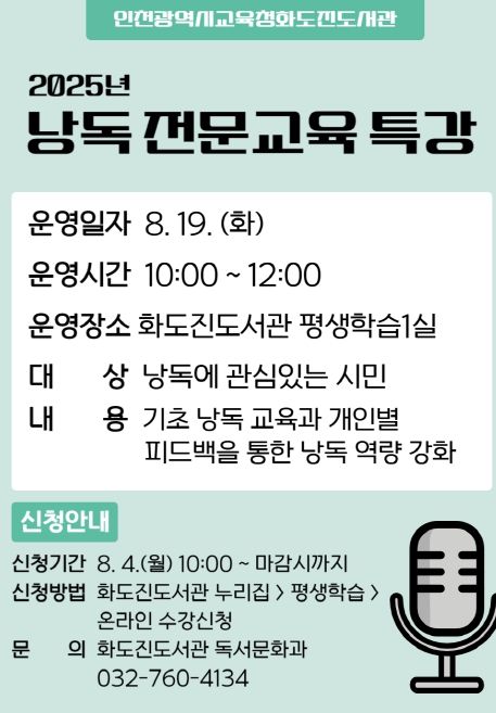 도민방송 문성호기자 | 인천광역시교육청화도진도서관은 낭독에 관심 있는 시민을 대상으로 낭독 전문교육을 운영한다.
