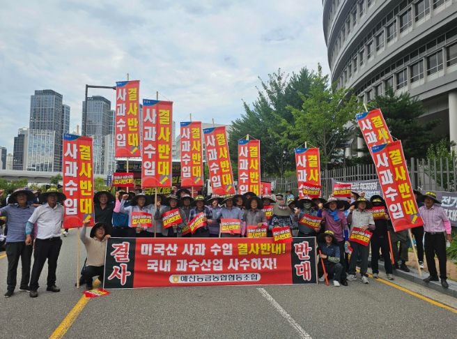 이날 행사에서는 ▲미국산 사과 수입 협의 즉각 중단 및 철회 ▲사과 수입 불가 원칙의 명확화 ▲국내 사과농가 생존권 보장과 경쟁력 제고 방안 마련 ▲국민과 함께 국산 과일을 지켜내기 위한 전국 농업인의 연대 강화 등을 담은 공동 결의문이 채택됐다.