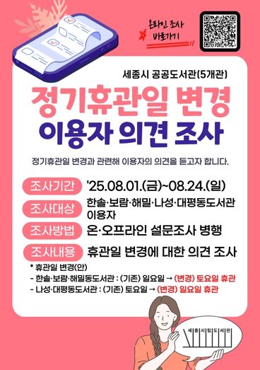 세종시립도서관 관계자는 “이번 조사는 인근 도서관 휴관일 중복으로 인한 이용 불편을 해소하기 위한 절차”라며 “많은 시민들이 참여하셔서 합리적인 휴관일 조정이 이뤄지길 바란다”고 말했다.