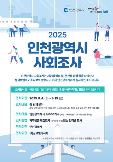 도민방송 문성호기자 | 인천광역시는 오는 8월 4일부터 9월 19일까지 시민 삶의 질과 지역 사회 전반의 현황을 파악하기 위한 ‘2025년 인천사회지표조사’를 실시한다고 밝혔다.