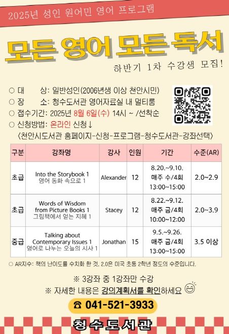수강 신청은 오는 8월 6일 오후 2시부터 천안시도서관 누리집에서 가능하며, 문의 사항은 청수도서관으로 하면 된다.
