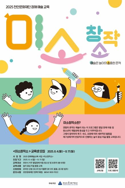 도민방송 문성호기자 | 천안문화재단은 오는 8월 17일까지 발달장애 아동을 위한 예술교육 프로그램 ‘미소창작소’의 참가자를 모집한다고 4일 밝혔다.