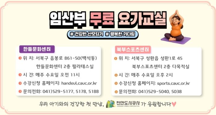도민방송 문성호기자 | 천안도시공사는 오는 9월 3일~ 11월 26일 한들문화센터와 북부스포츠센터에서 ‘임산부 요가교실’을 운영한다고 4일 밝혔다.