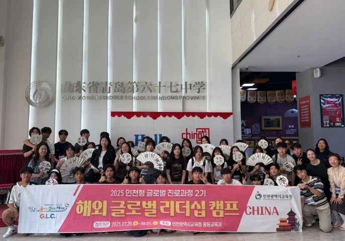 도민방송 문성호기자 | 인천광역시교육청은 7월 28일부터 8월 1일까지 4박 5일간 인천 관내 일반계고 2학년 학생 77명을 대상으로 중국 청도와 일본 오사카에서 ‘2025 인천형 글로벌 진로과정 2기 해외 글로벌 리더십 캠프’를 운영했다.
