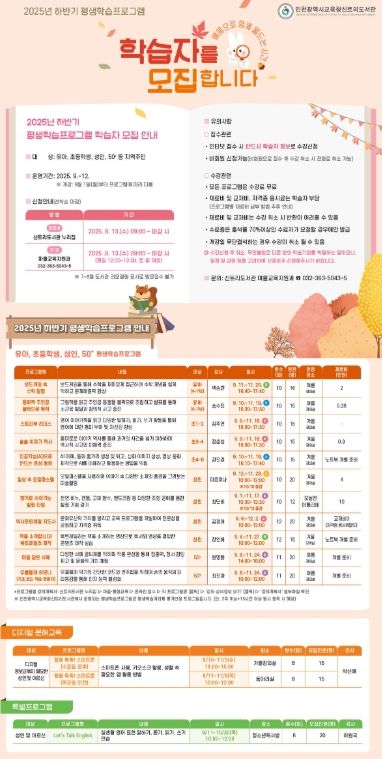 도민방송 문성호기자 | 인천광역시교육청신트리도서관은 오는 8월 13일부터 2025년 하반기 평생학습프로그램 수강생을 모집한다.