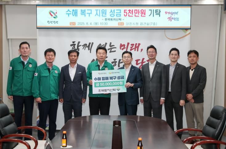 오성환 당진시장은 “어려운 시기에 따뜻한 손길을 내밀어 준 한국토지신탁에 깊은 감사를 드린다”며, “전달해주신 성금은 피해 주민들의 빠른 회복과 일상 복귀를 위한 긴급 복구 지원에 소중히 사용하겠다”고 말했다.
