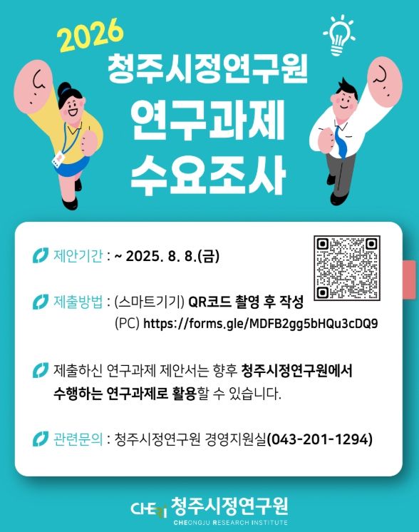 도민방송 임경희기자 | 청주시정연구원은 오는 8일까지 2026년도 연구과제 발굴을 위한 수요조사를 실시한다고 밝혔다.