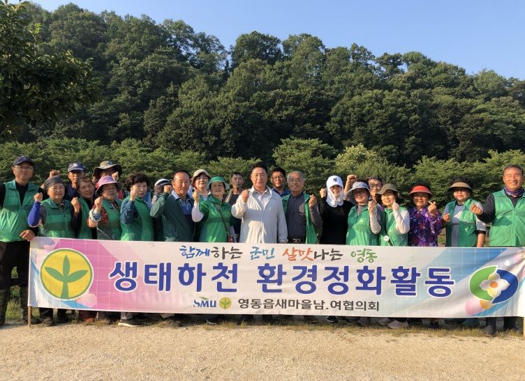 남성 회원들은 예초기 등을 동원하여 영동천 제방의 풀베기 작업을 실시했고, 부녀회원들은 둑방 주변의 잡초 제거 및 하천변 일대에 방치된 폐비닐, 플라스틱병 등 하천으로 유입된 오염물질 수거에 구슬땀을 흘렸다.